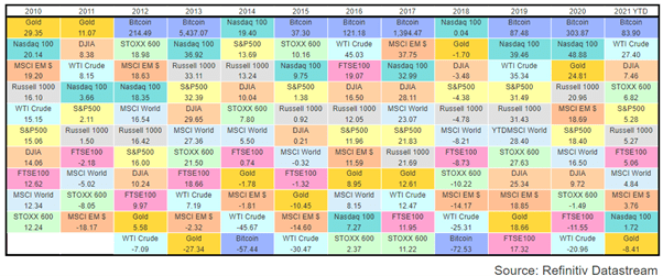 There’s not really much we can say about this chart, except that bitcoin has been a seriously high-octane asset during its rookie decade. The high returns look extremely attractive, but don’t miss those two horrifying years, in 2014 and 2018. Could you have stomached those losses?
