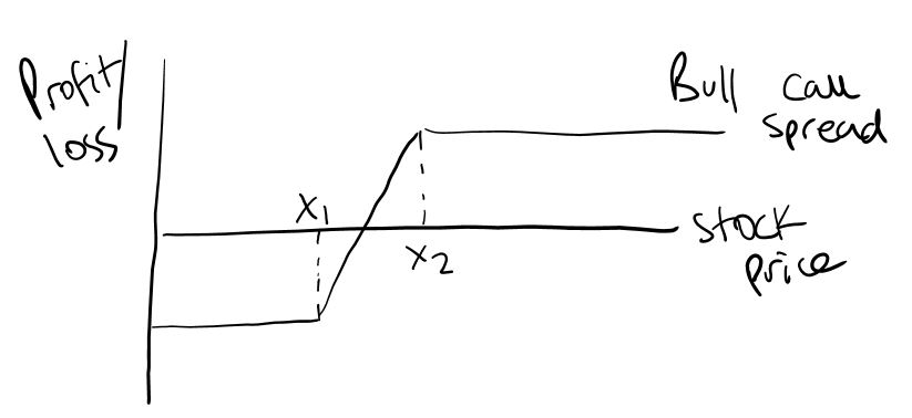 The investor buys a call with strike price X1, paying a premium for doing so. As the stock price rises above X1, the position will start to make money as the option becomes ‘in the money’ (that is, ‘in’ the money for the buyer of the option). If this were a naked long call, then potential gains could be unlimited if the stock price keeps rising. However, using a spread limits these gains, by selling a call with a strike price X2. As the price rises above X2, the long and short calls offset each other and there is no impact on the profit of the strategy. The reason to limit gains in this manner is to reduce the overall premium paid. An investor would implement such a strategy if they felt that the stock price was going to go up, but not by much.